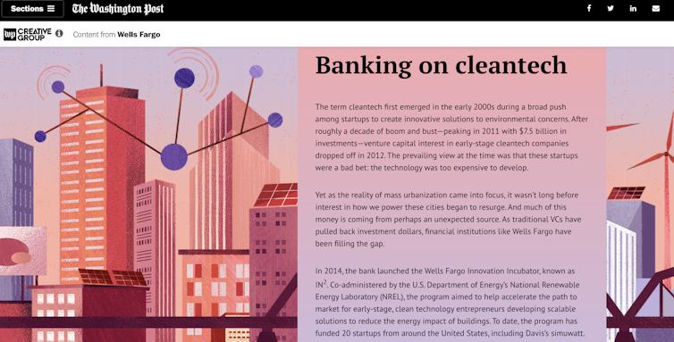 For example, Wells Fargo – a multinational financial services company plagued by a litany of scandals, such as deceiving customers with fake bank accounts – engaged the content studios of The New York Times, The Washington Post and The Wall Street Journal to create nearly a dozen native ads. One, created by The Washington Post’s BrandStudio, touted how Wells Fargo was investing in a cleaner environmental future. If it had been a real news article, it would have reported that the company was also financing the controversial underground oil transport system, the Dakota Access Pipeline.
